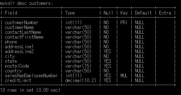 desc "테이블명"; 을 통해서 모든 테이블을 각각 확인해 볼 수 있습니다. 위 사진은 customers테이블의 컬럼과 데이터 타입을 보여줍니다.