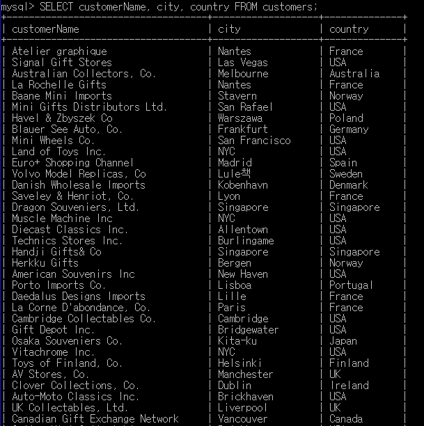 Ex1) SELECT customerName, city, country FROM customers;