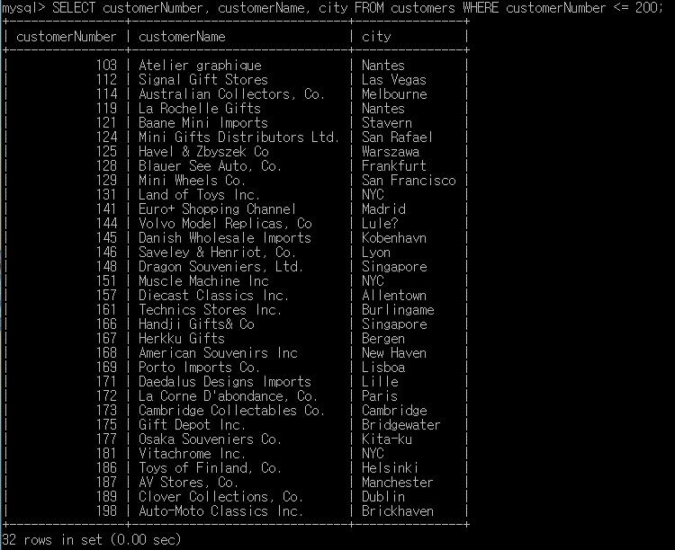 다음은 customer라는 테이블에서 customerNumber, customerName, city 컬럼을 불러오고, 그 중 customerNumber가 200 이하인 고객의 정보만 불러오는 명령입니다.